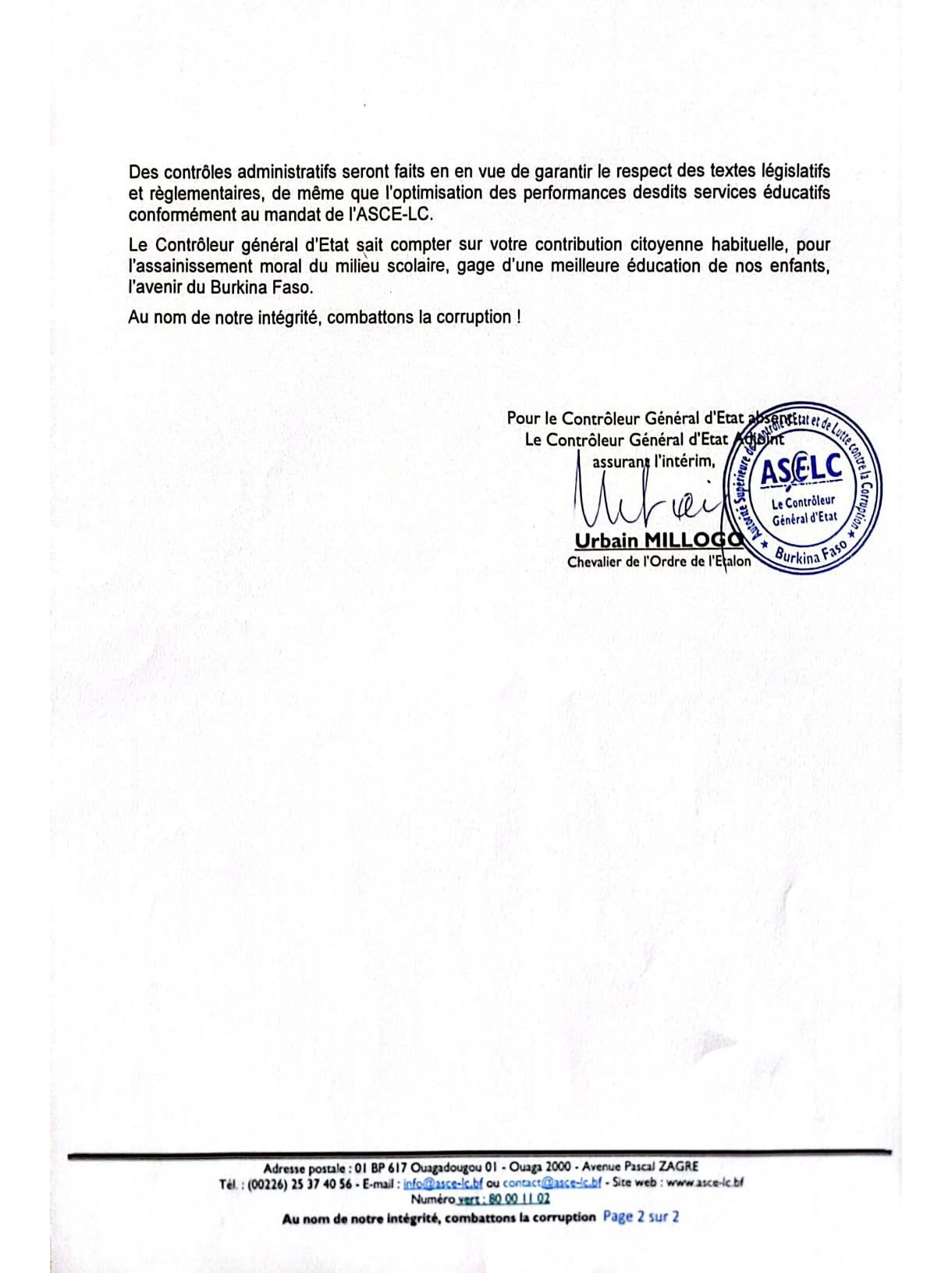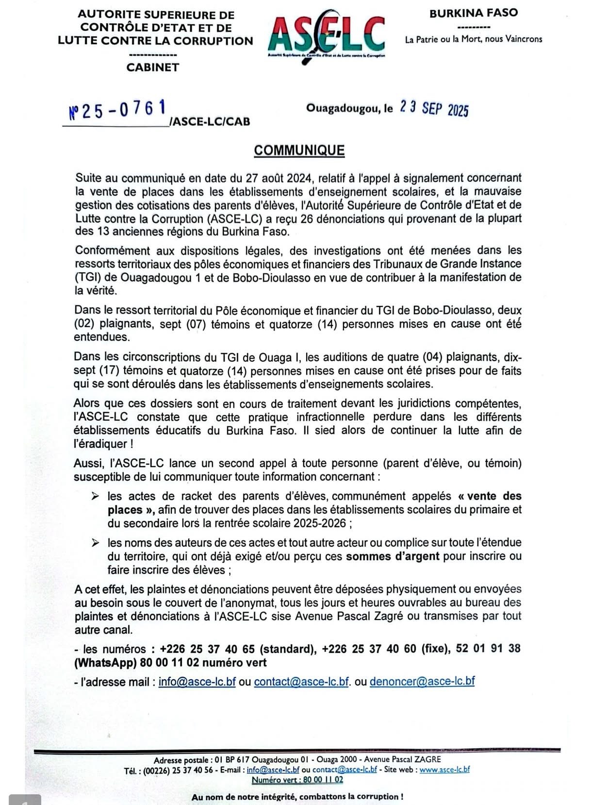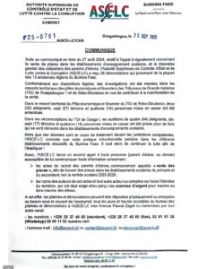 Les dénonciations peuvent être transmises anonymement par courrier, par téléphone, par WhatsApp, par mail ou directement au siège de l’ASCE-LC, sis à l’Avenue Pascal Zagré.