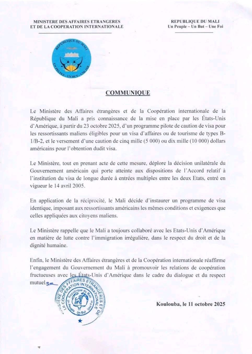 Le Ministère malien des Affaires étrangères et de la Coopération internationale a publié, le 11 octobre 2025, un communiqué annonçant la décision du Gouvernement du Mali d’appliquer le principe de réciprocité en matière de visas vis-à-vis des États-Unis d’Amérique.