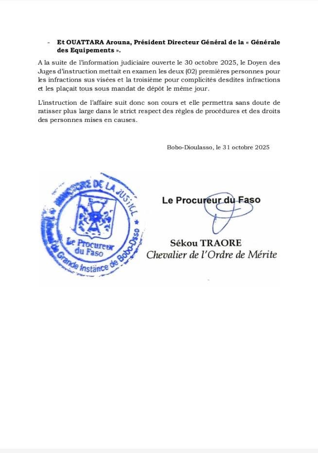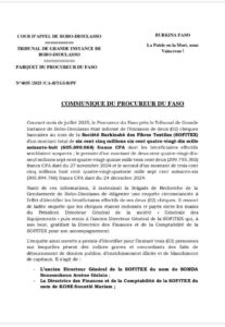 Bobo-Dioulasso, 31 octobre 2025 – Le Procureur du Faso près le Tribunal de Grande Instance de Bobo-Dioulasso a annoncé, dans un communiqué officiel, l’ouverture d’une instruction judiciaire visant trois personnes impliquées dans une affaire de détournement de fonds publics.