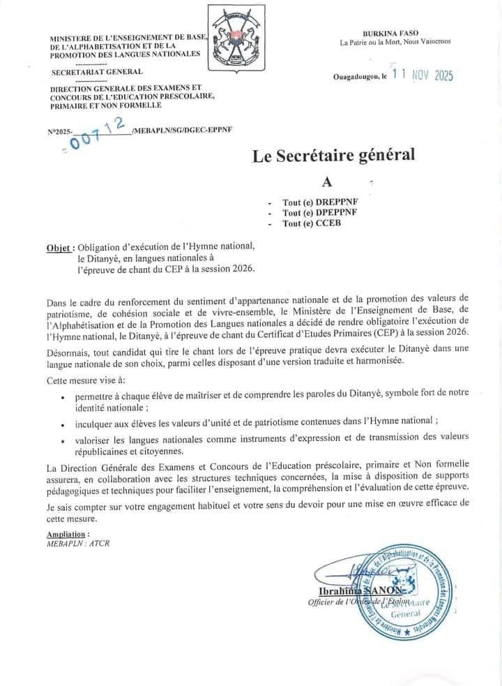 Dans une circulaire datée du 11 novembre 2025, le Ministère de l’Enseignement de Base, de l’Alphabétisation et de la Promotion des Langues Nationales (MEBAPLN) annonce une mesure forte : à partir de la session 2026 du Certificat d’Études Primaires (CEP), l’exécution de l’Hymne national, le Ditanyè, sera obligatoire dans une langue nationale lors de l’épreuve de chant.