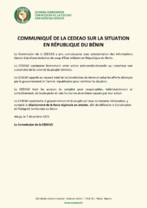 Dans son communiqué, la CEDEAO a réaffirmé son soutien au gouvernement béninois et à la population par tous les moyens nécessaires, y compris le recours à la force régionale en attente, afin de protéger la Constitution et l’intégrité territoriale du pays.