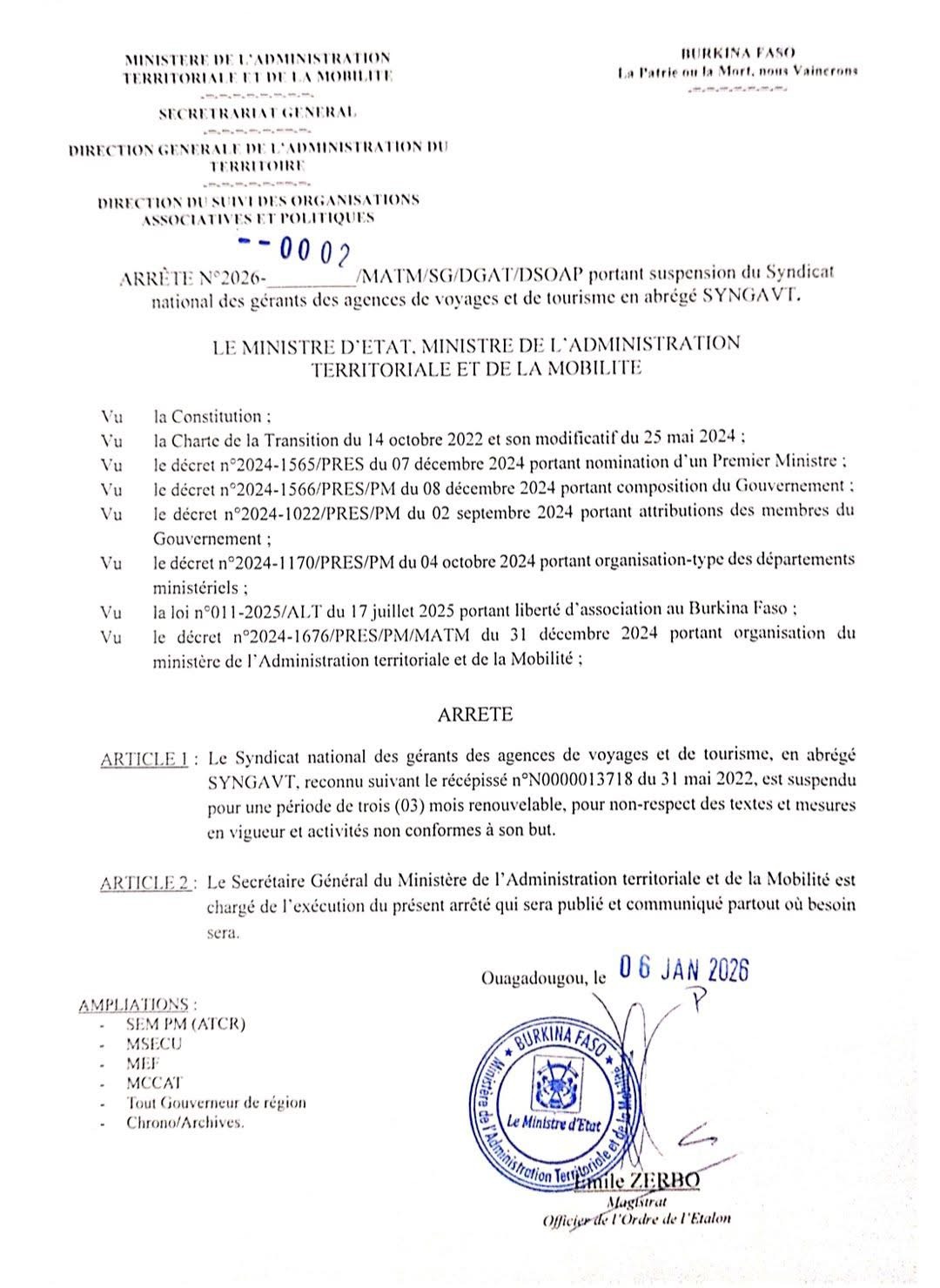 Le Syndicat national des gérants des agences de voyages et de tourisme (SYNGAVT) a été officiellement suspendu pour une durée de trois mois renouvelables, selon un arrêté signé le 6 janvier 2026 à Ouagadougou par le ministre d’État, ministre de l’Administration territoriale et de la Mobilité.