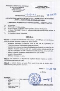 La décision, datée du 16 janvier 2026, émane du ministère de l’Administration territoriale et de la Décentralisation. Le document précise que l’interdiction concerne le journal Jeune Afrique “sous toutes ses formes” et qu’elle prend effet à compter de la date de signature.