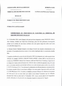 Selon le communiqué officiel daté du 6 février 2026, le Parquet a été saisi le 10 décembre 2025 par deux plaignants. Ces derniers reprochaient à WEREME Abdoul-Aziz Amaran, résidant aux États-Unis d’Amérique, des faits présumés d’escroquerie portant sur la somme de 112 383 900 francs CFA.