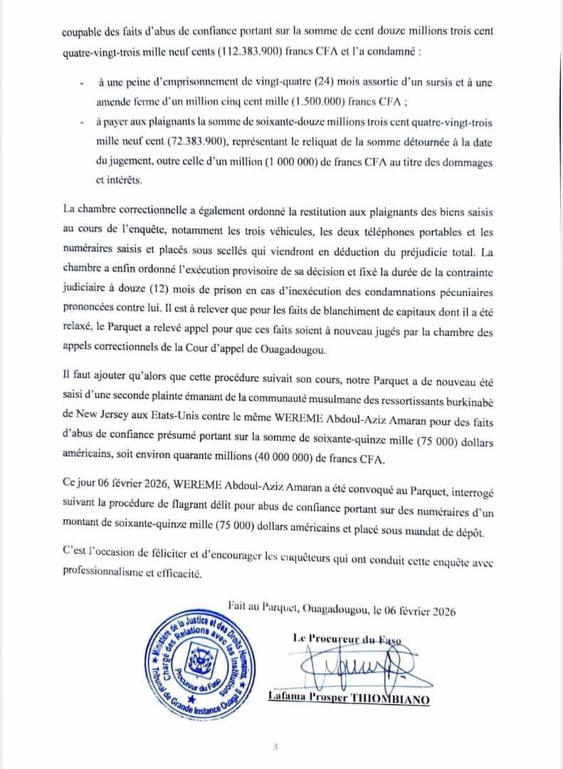 Enfin, alors que la procédure suivait son cours, une seconde plainte a été déposée par la communauté musulmane des ressortissants burkinabè du New Jersey contre le même prévenu pour des faits similaires d’abus de confiance portant sur 75 000 dollars américains, soit environ 40 millions de francs CFA. Le 6 février 2026, WEREME Abdoul-Aziz Amaran a été de nouveau convoqué, interrogé suivant la procédure de flagrant délit et placé sous mandat de dépôt.
