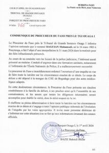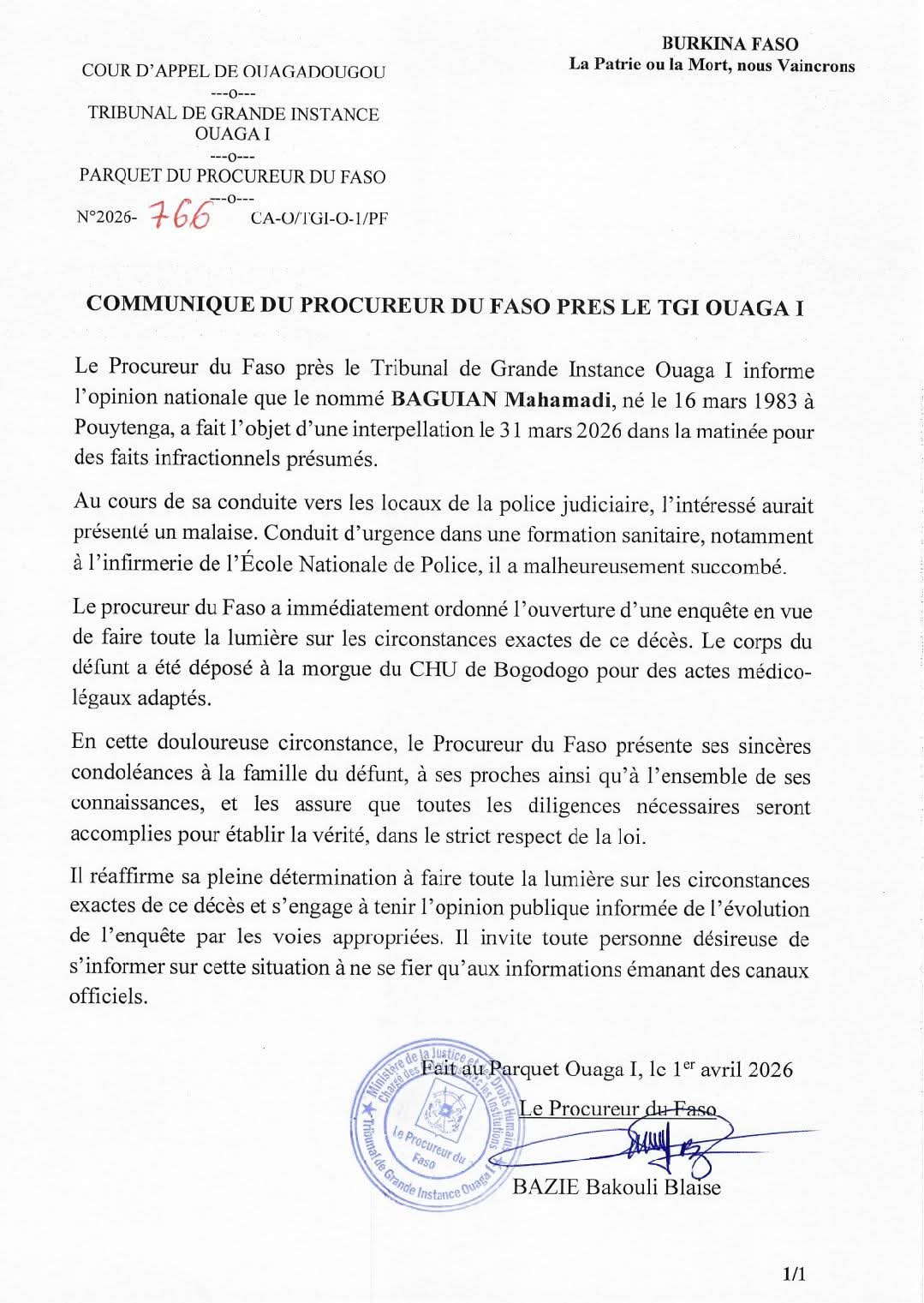 Ouagadougou, 1er avril 2026 – Le Procureur du Faso près le Tribunal de Grande Instance (TGI) Ouaga I a annoncé l’ouverture d’une enquête suite au décès de Baguián Mahamadi, interpellé le 31 mars 2026 pour des faits infractionnels présumés.